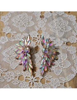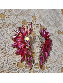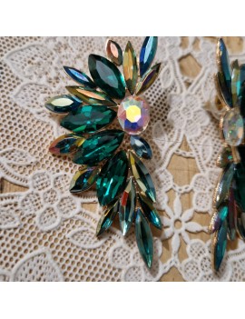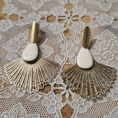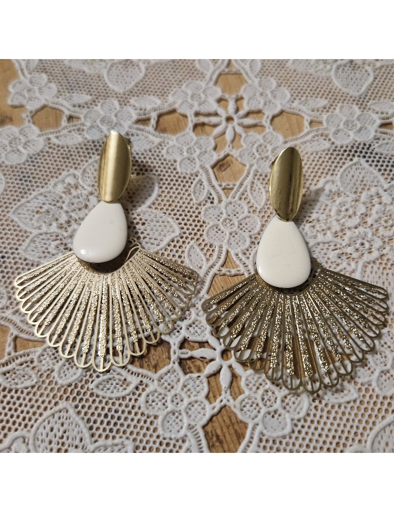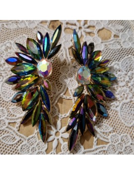 Puces d'oreille avec un grand éventail scintillant et son pendentif émaillé en forme de goutte.
