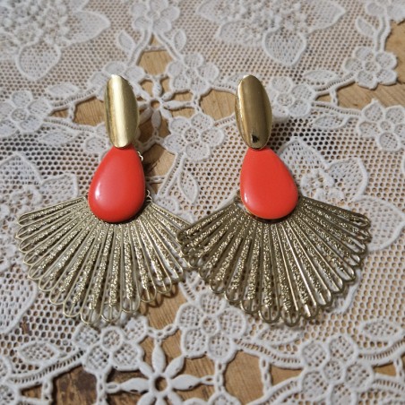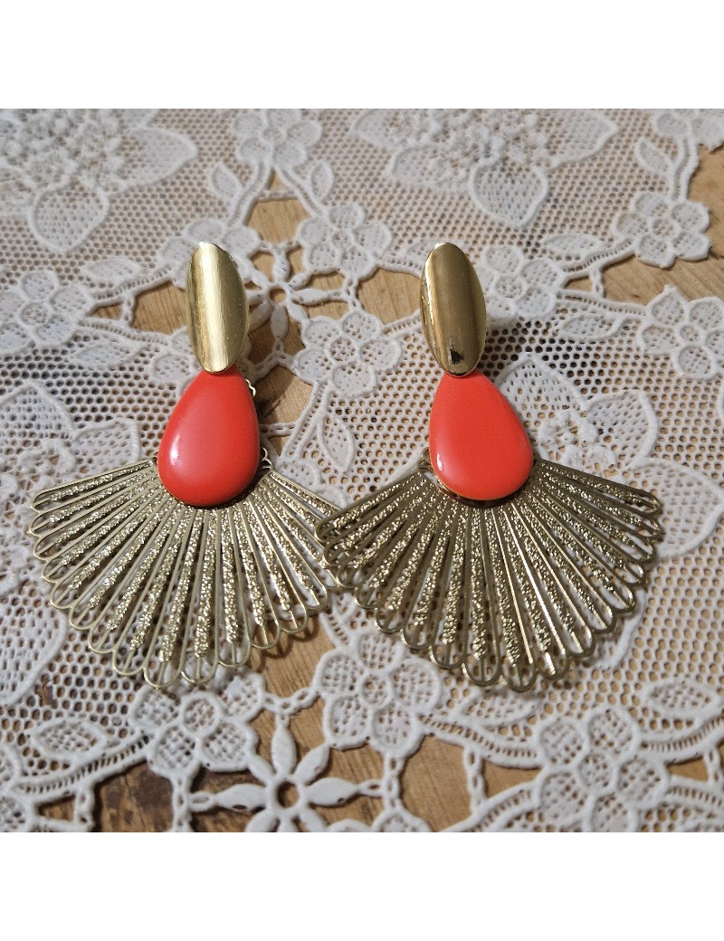 Puces d'oreille avec un grand éventail scintillant et son pendentif émaillé en forme de goutte.